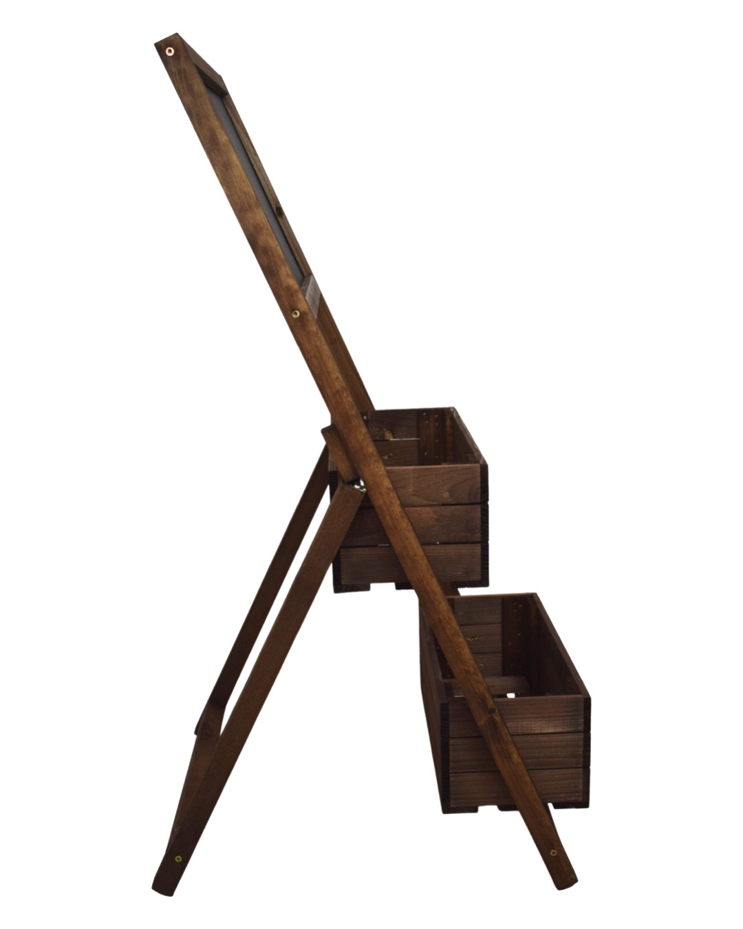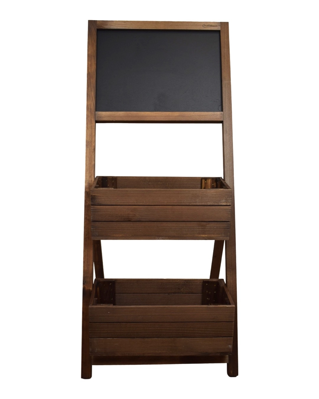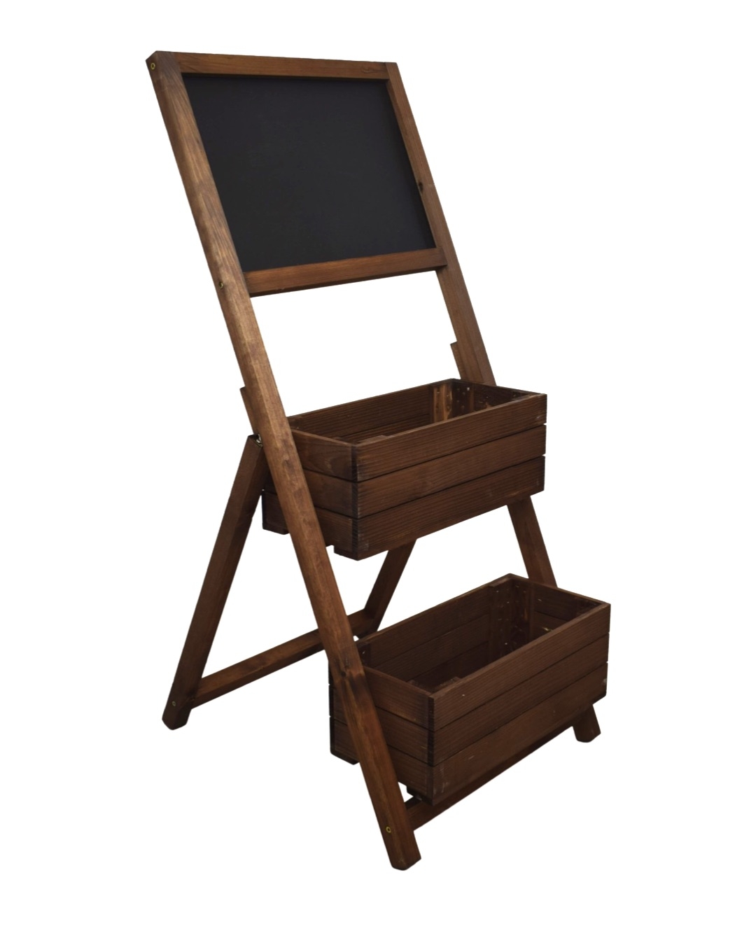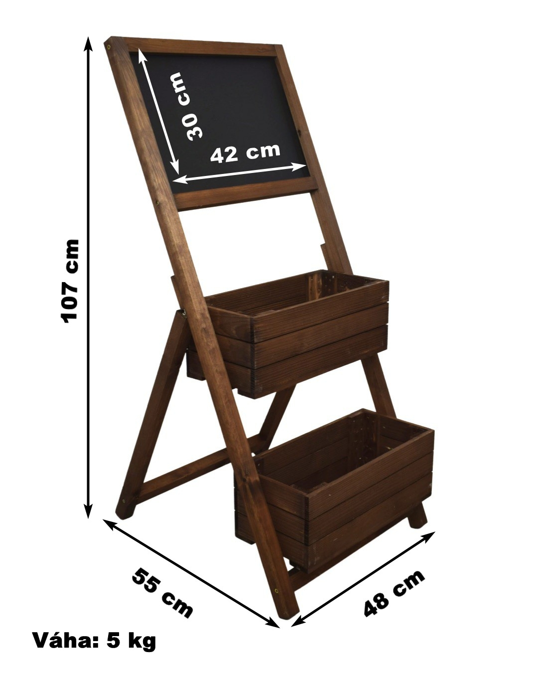 Stojan je vyroben z kvalitního smrkového dřeva. Tento krásný stojan se dvěma truhlíky není jen krásná funkční dekorace, ale bude i skvělou reklamou pro vaši provozovnu. Bude se skvěle vyjímat před květinářstvím, restaurací, kavárnou nebo jiným obchodem. Na dostatečně velkou tabuli lze napsat prakticky cokoliv, co upoutá pozornost kolemjdoucích. Osázený stojan krásnými květinami okamžitě zaujme vaše zákazníky. Na tabuli lze psát klasickou křídou a údržba je velmi snadná. Pro setření křídy vám postačí obyčejná mokrá houba nebo hadřík. Stojan dodáváme ve složeném stavu, není nutná žádná montáž.