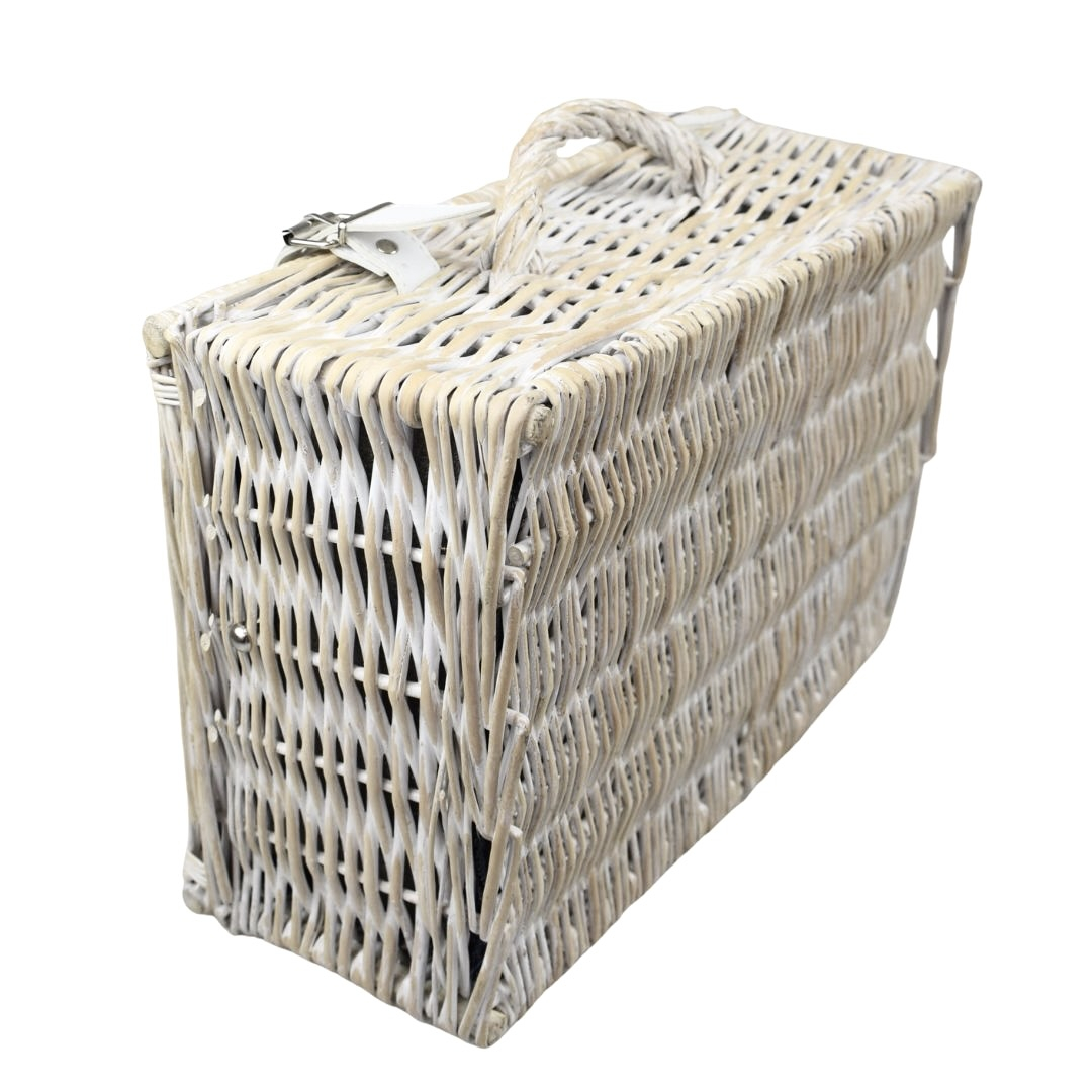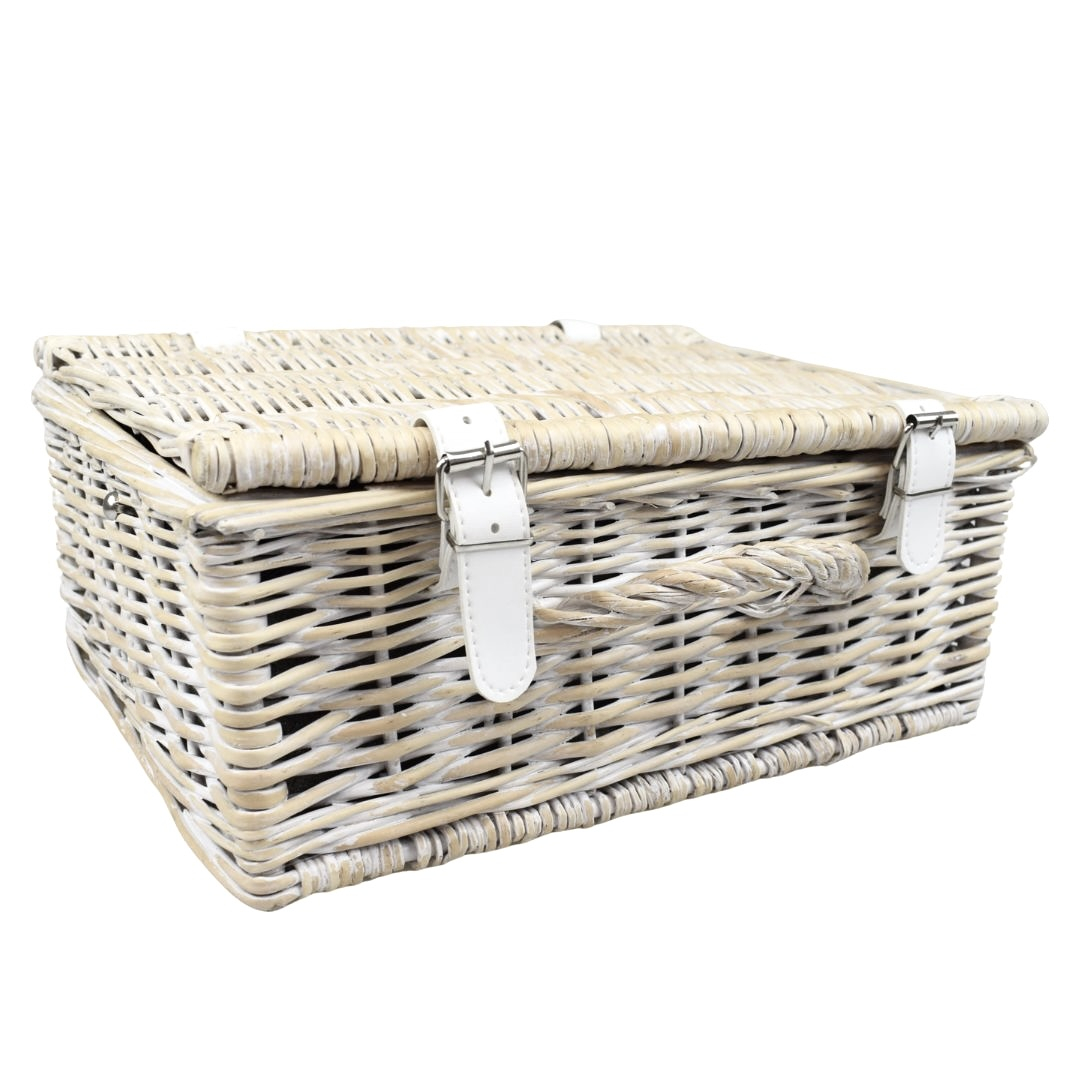 Piknikový koš pro dvě osoby je stylovým a praktickým doplňkem pro milovníky stolování v přírodě. Koš je ručně vyroben z kvalitního loupaného vrbového proutí s elegantní béžovo-bílou patinou. Uvnitř je obšitý modrou látkou, která dodává příjemný kontrast a zároveň chrání obsah koše.