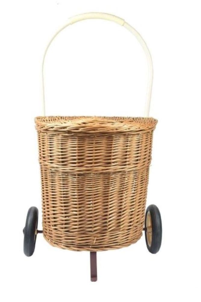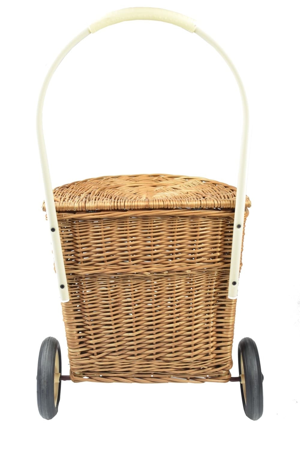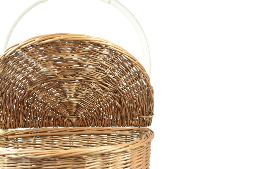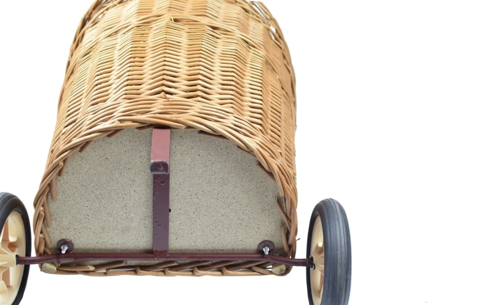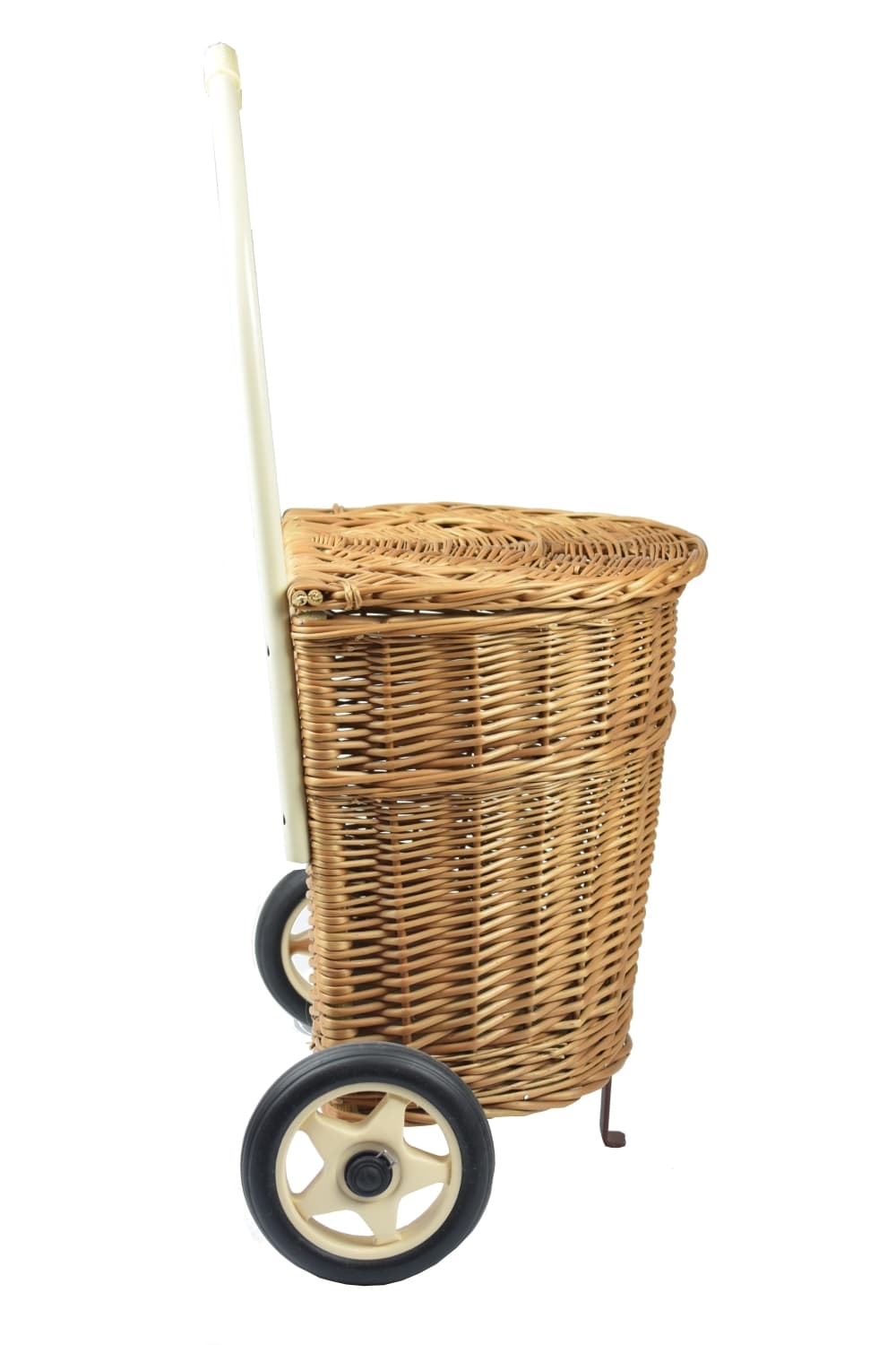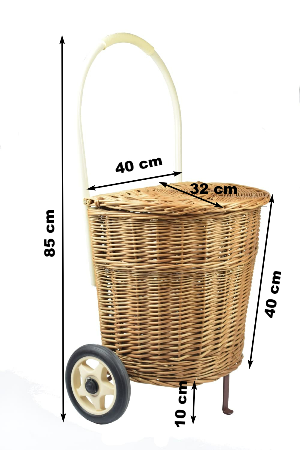 Materiál: Vrbové proutí loupané, kovová rukojeť, pevné dno z dřevotřísky, plastová kolečka s gumou.